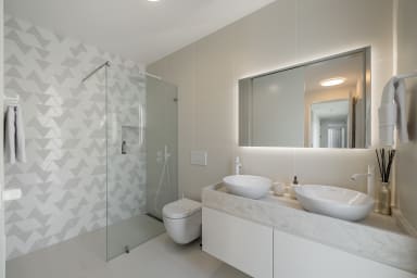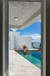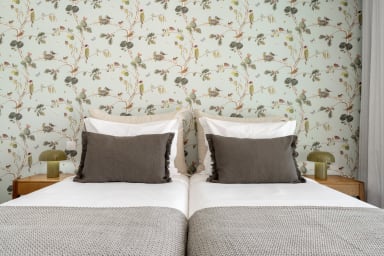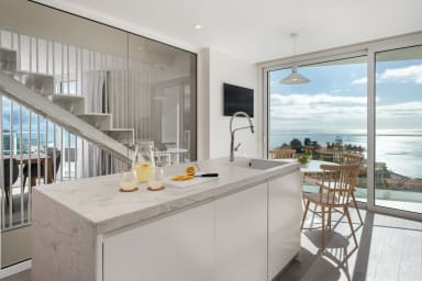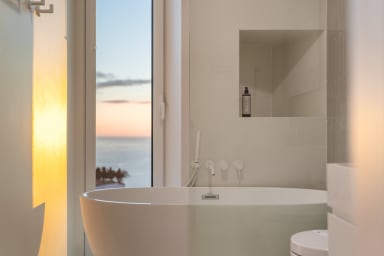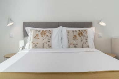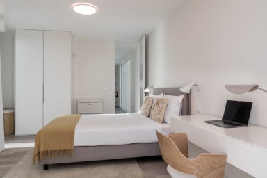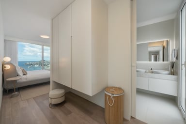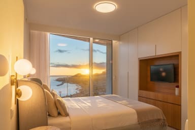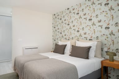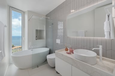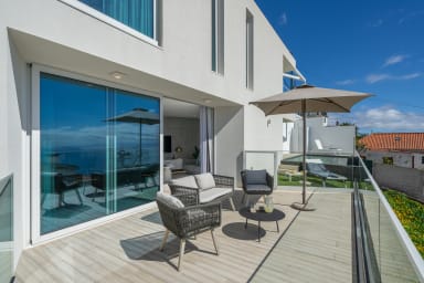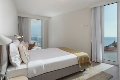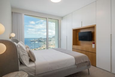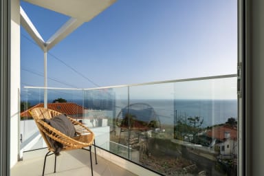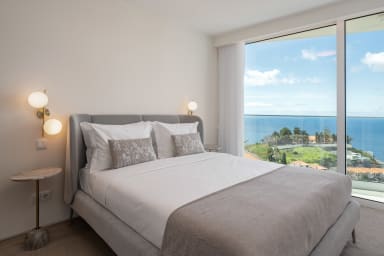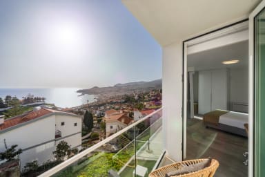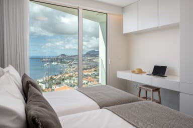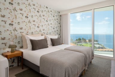 Im Obergeschoss bietet die Villa drei Schlafzimmer, alle mit Balkon und Blick auf die Bucht von Funchal: eine Suite mit Dusche, ein Schlafzimmer mit zwei Einzelbetten und ein Schlafzimmer mit Doppelbett, die für Komfort, Privatsphäre und natürliches Licht sorgen.